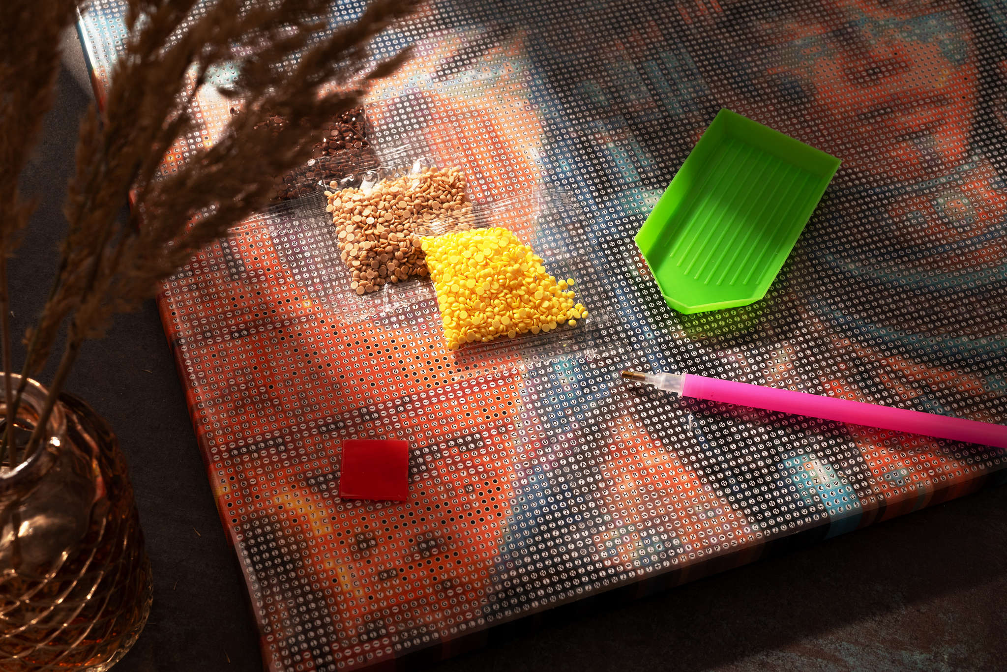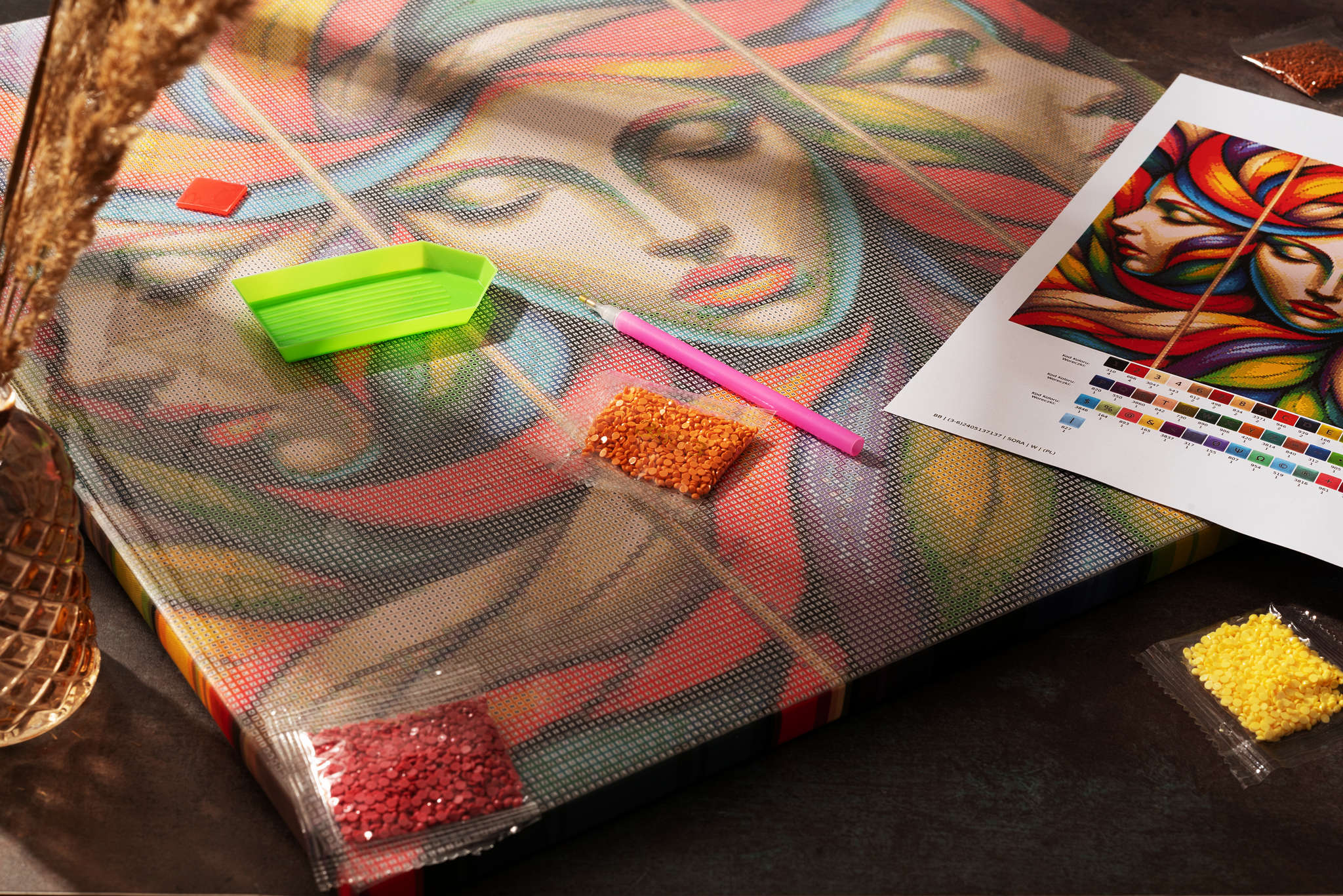 - Woreczki z ponumerowanymi diamencikami i odpowiednimi symbolami ułatwiającymi ich przyporządkowanie do odpowiedniego koloru na wzorze