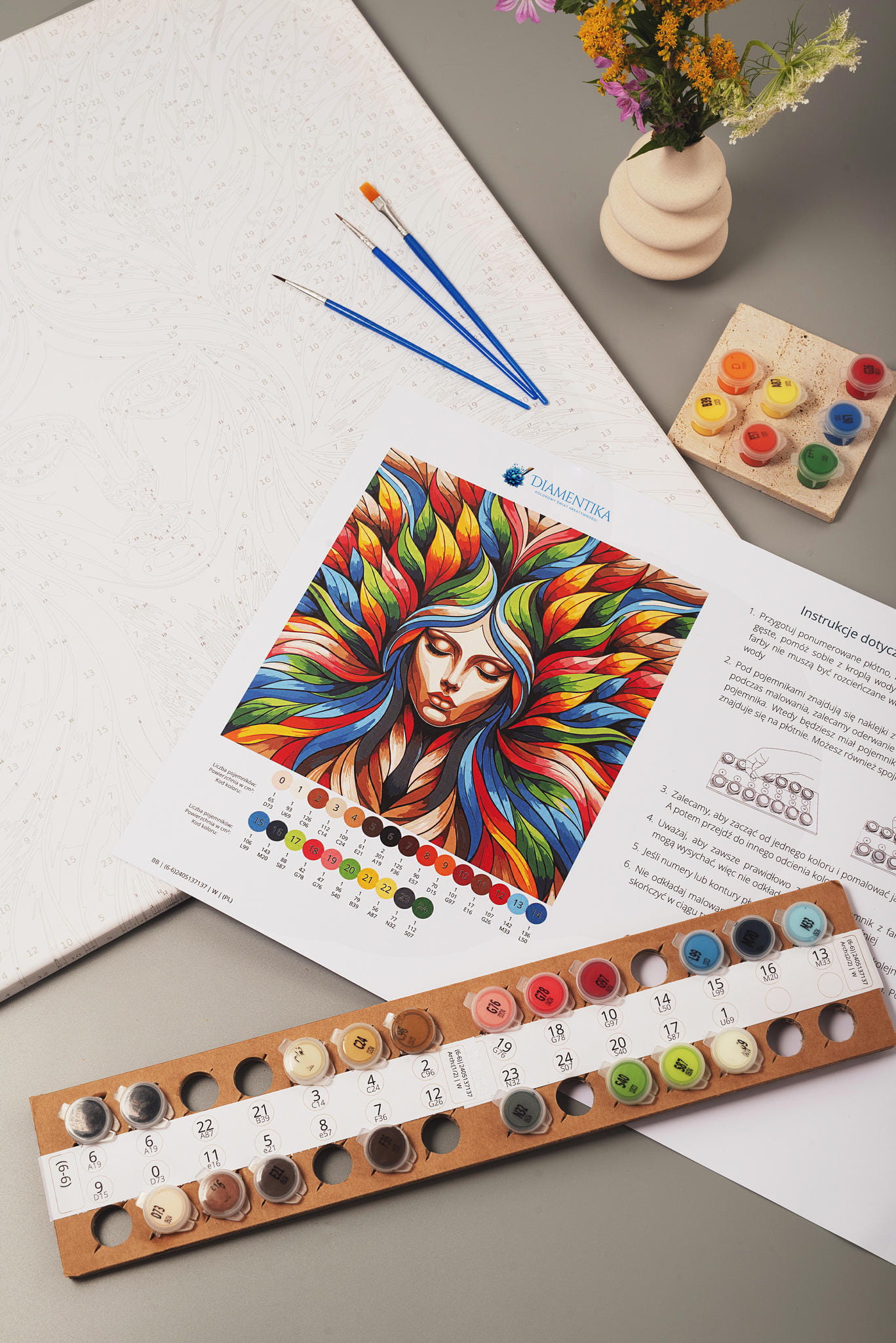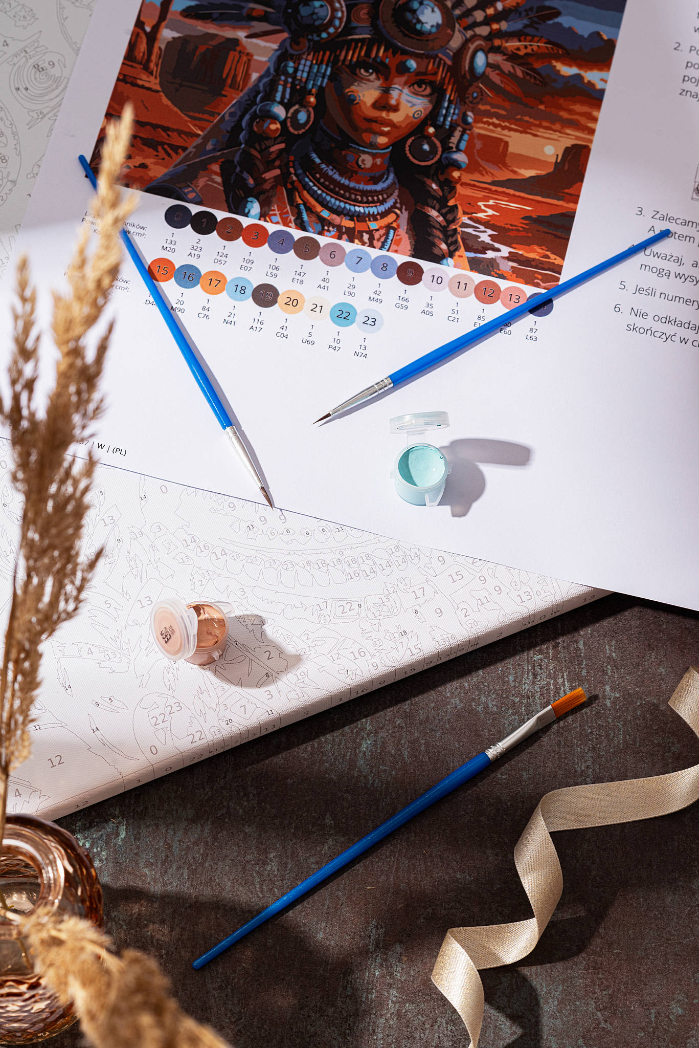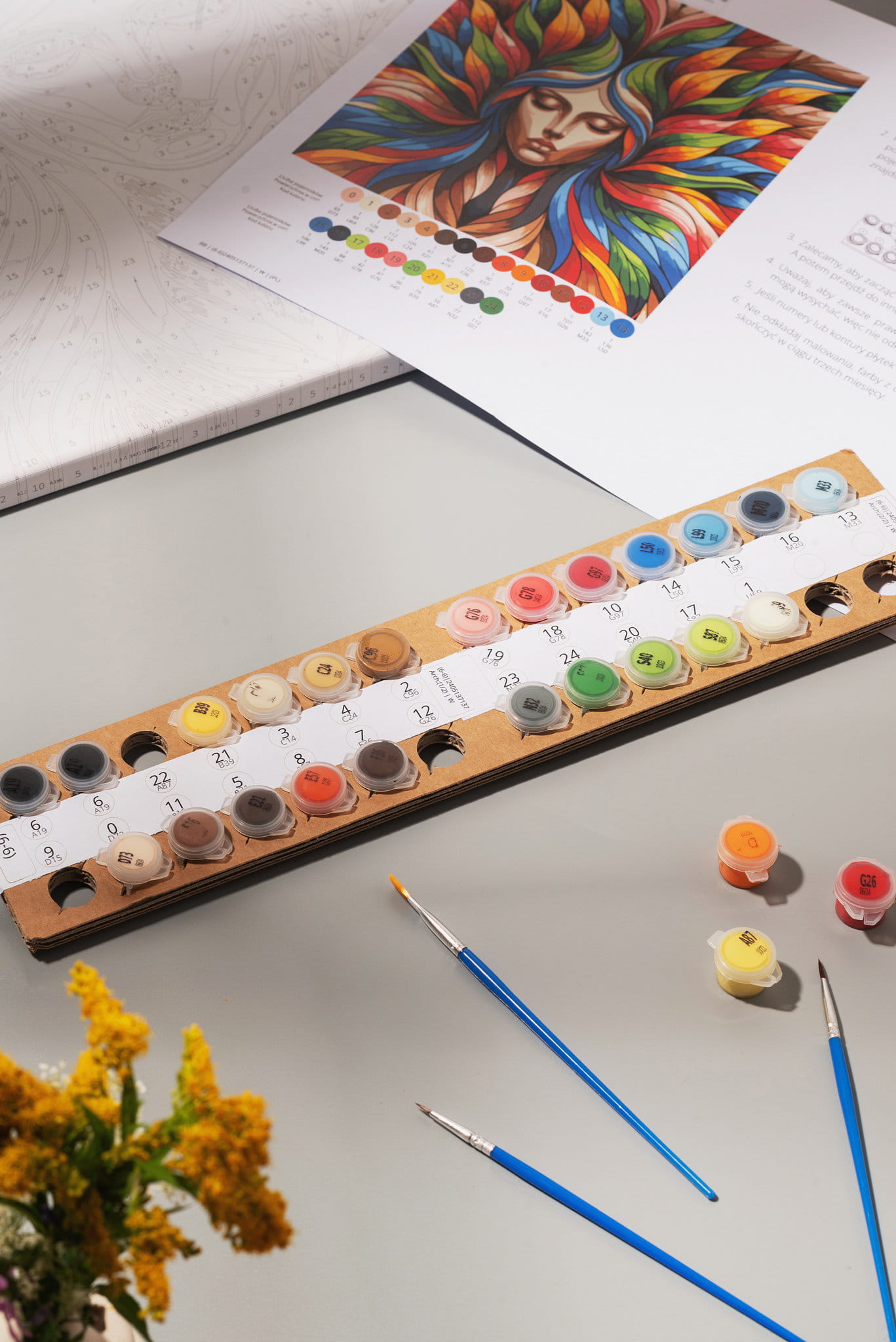 - Farby akrylowe na bazie wody w intensywnych, pięknych kolorach. Ilość kolorów dobrana jest idealnie do wzoru obrazu i jego wielkości